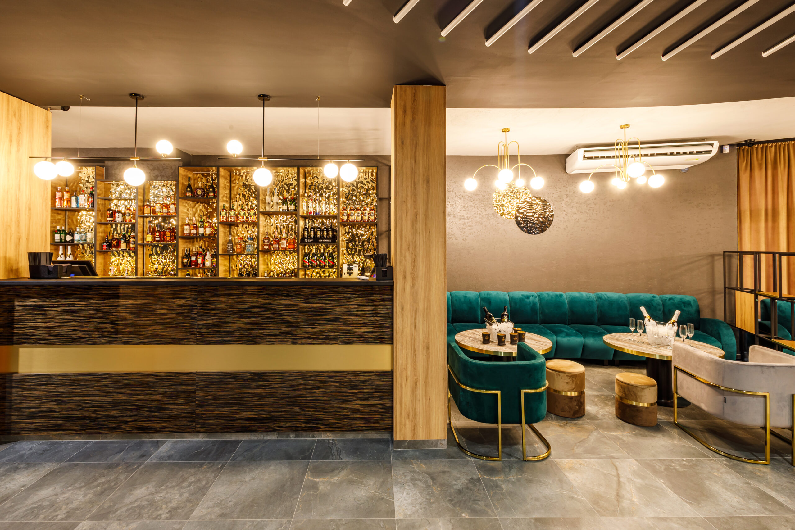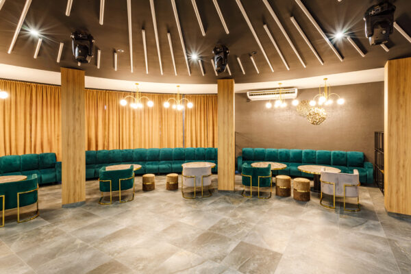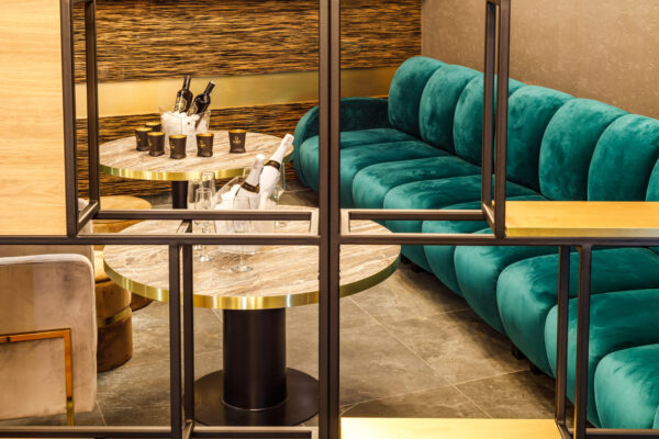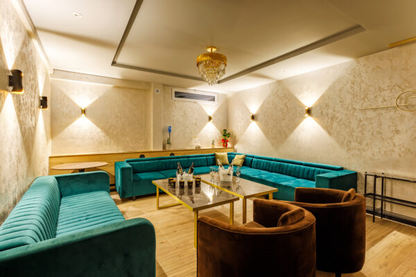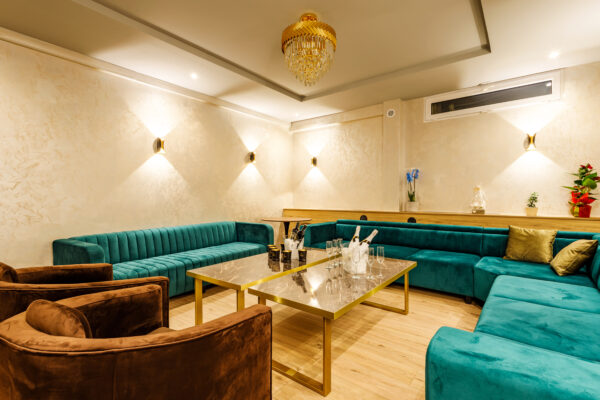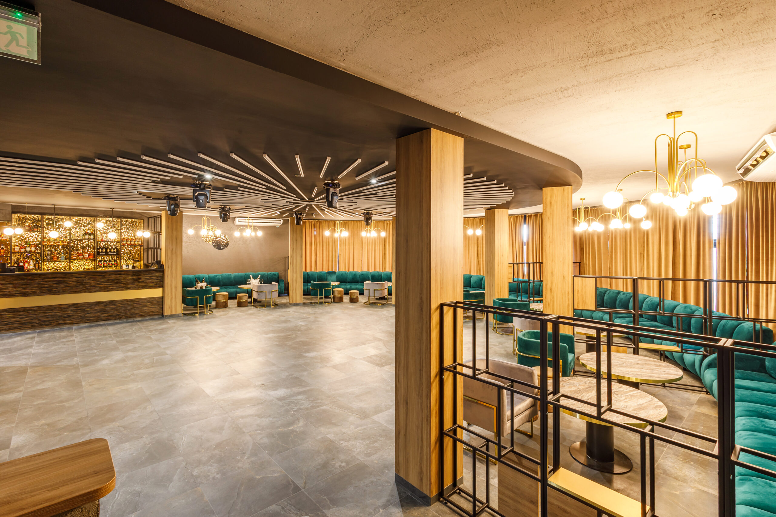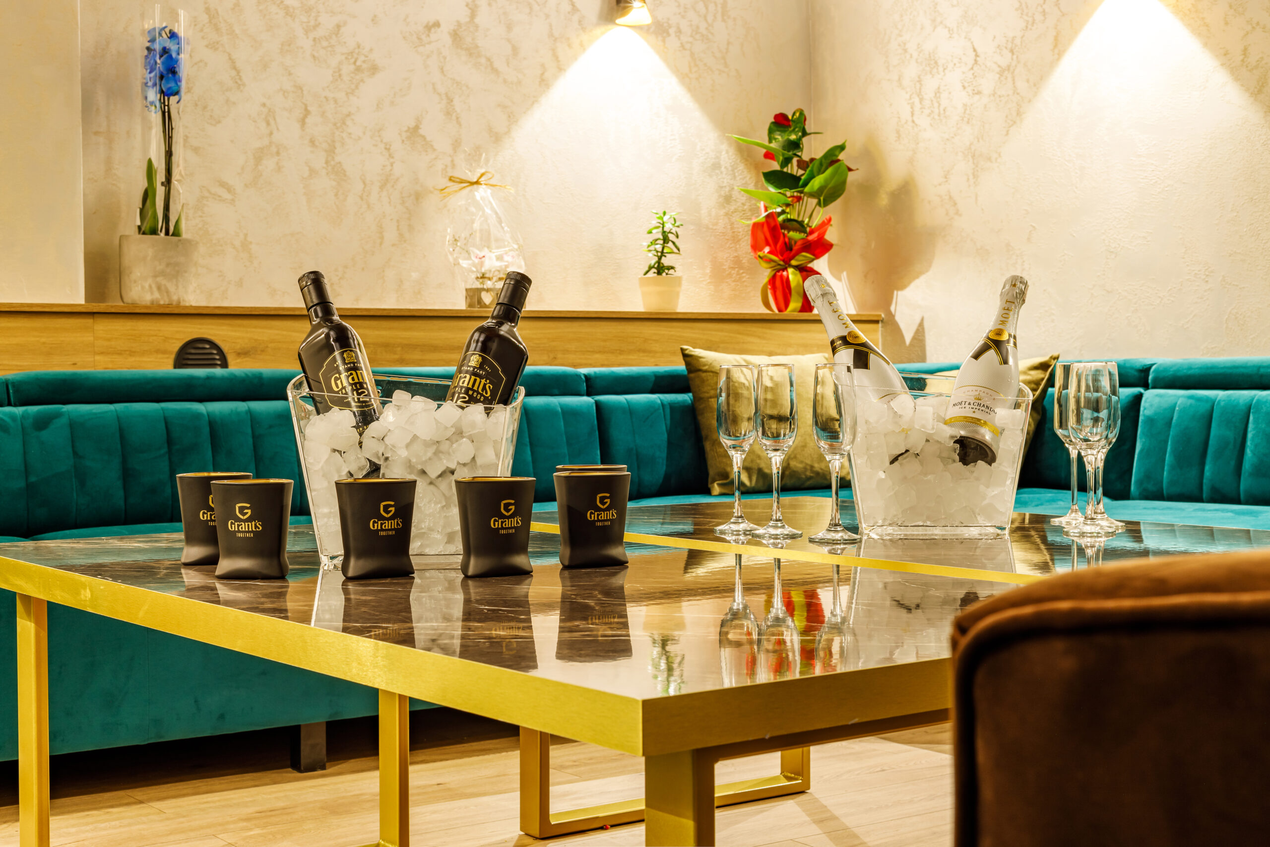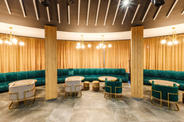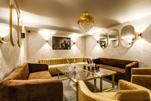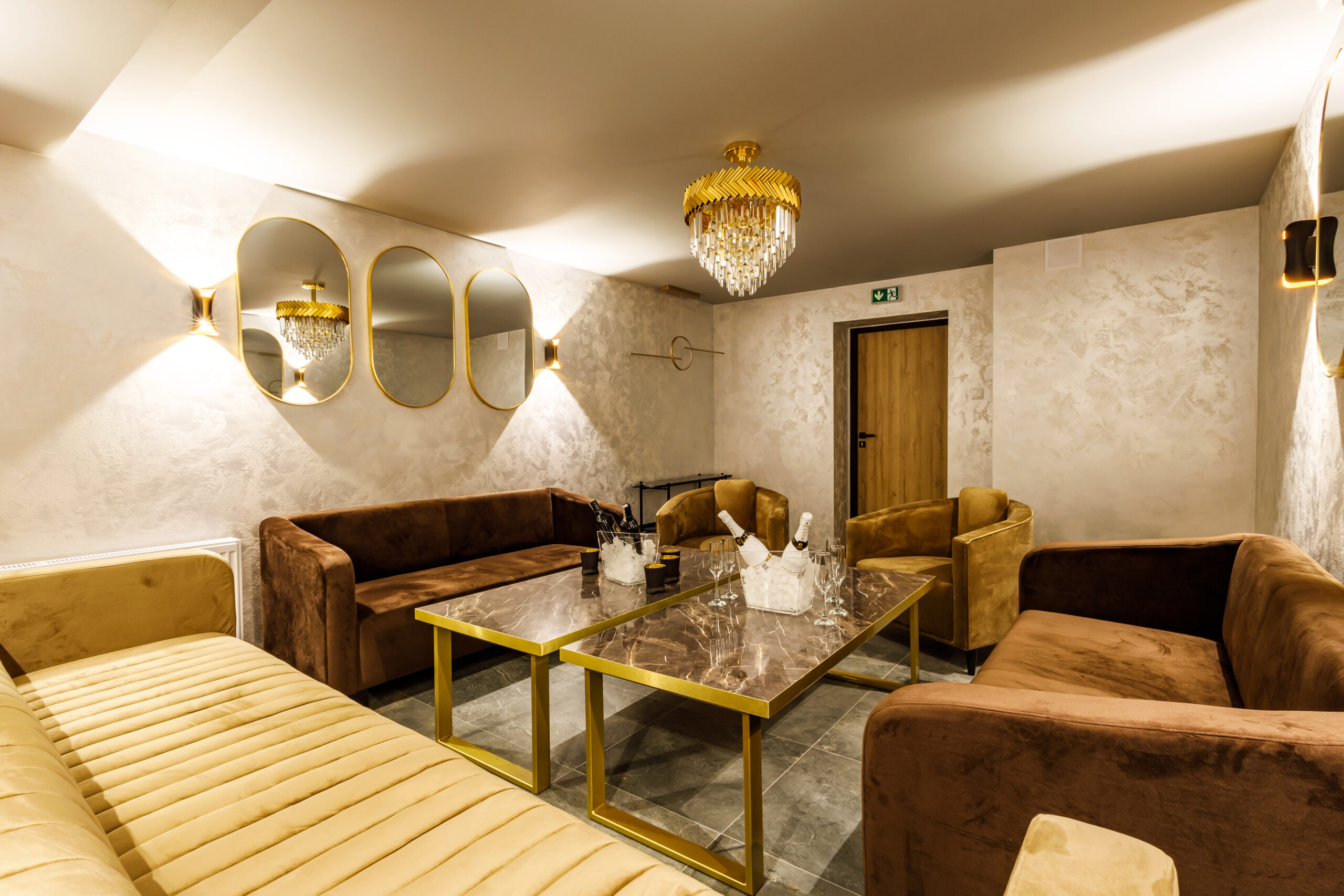 Nasza przestrzeń urzeka pięknym wnętrzem w odcieniach czerni, złota i zieleni, dysponując około 90 miejscami siedzącymi, w tym dwoma luksusowymi pokojami vipowskimi, które można zarezerwować przez naszą stronę.