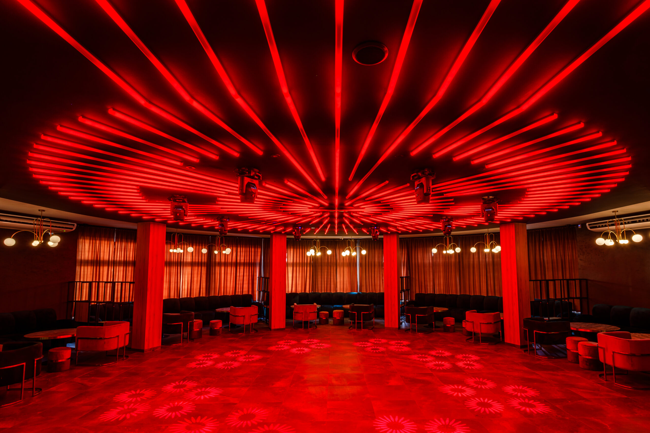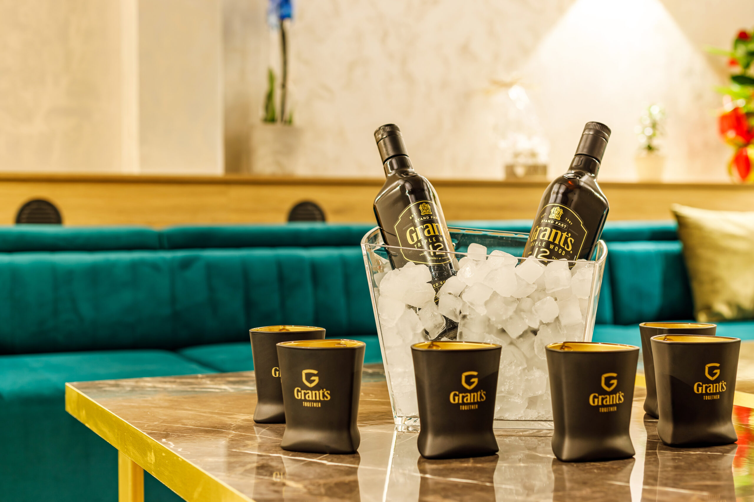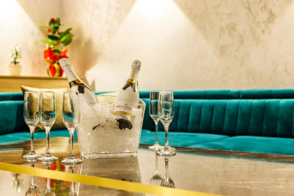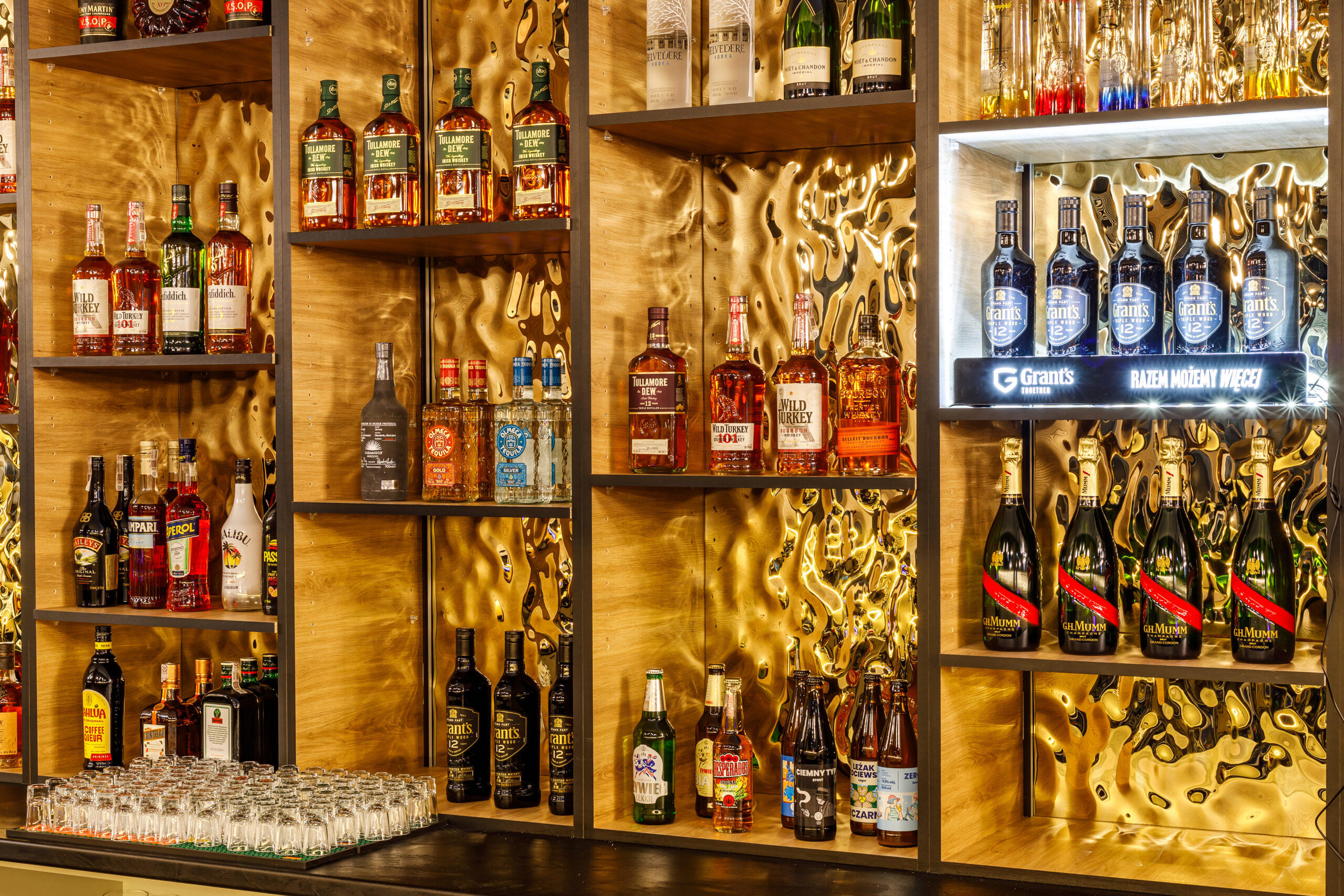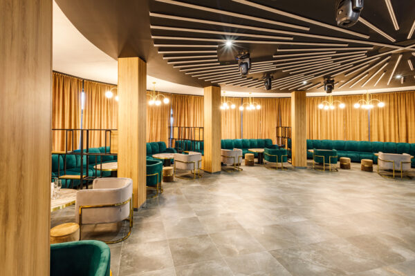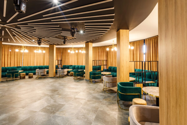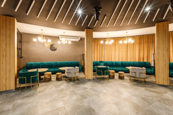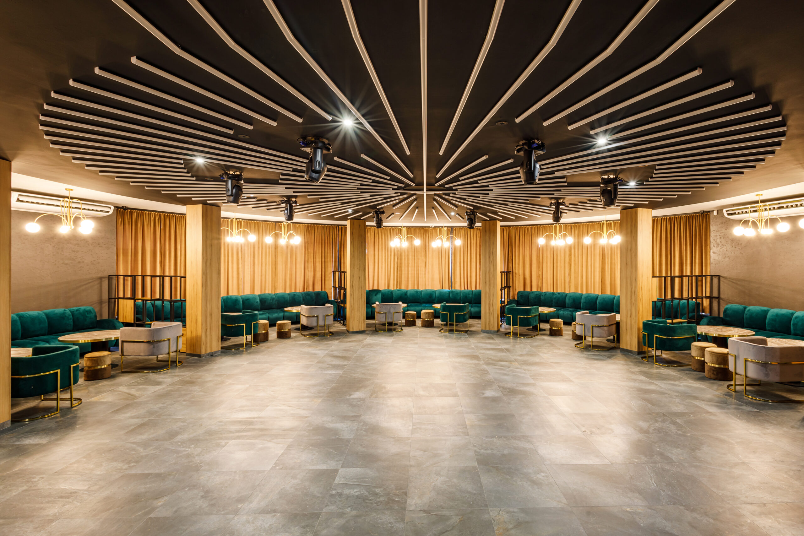 Nasza przestrzeń urzeka pięknym wnętrzem w odcieniach czerni, złota i zieleni, dysponując około 90 miejscami siedzącymi, w tym dwoma luksusowymi pokojami vipowskimi, które można zarezerwować przez naszą stronę.